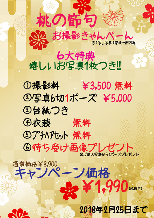 お得なキャンペーン情報, ベビー&キッズ 桃の節句 ~女の子の大切な日~ シンデレラスタッフ 2018年1月19日 桃の節句キャンペーン!! お写真六切り1枚ついて、この価格!! ご予約はお早めに♪ ← Web限定!!卒園・卒業キャンペーン ご成人の記念撮影は是非、お着物で!! →