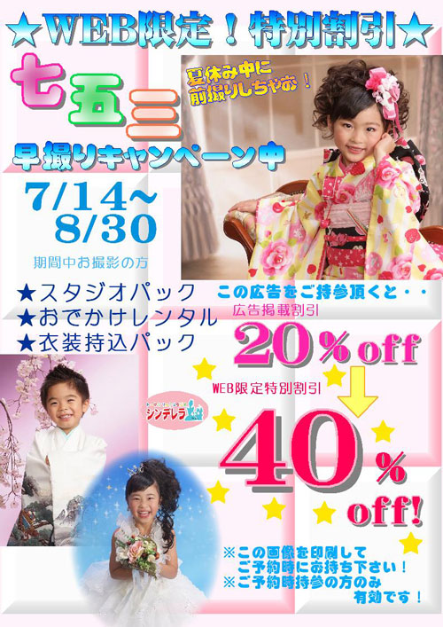 お得なキャンペーン情報, 七五三 ☆七五三キャンペーンお得情報☆ シンデレラスタッフ 2011年7月15日 No Comments 早撮りキャンペーン第三弾開催! 夏休みも開催中!平日にゆっくりお撮影がオススメ(^0^)/ 上記の画像を印刷してお持ちいただくと 広告掲載割引よりダンゼンお得です☆ ↓現在出ている広告です☆ ご相談・お問合せ・・などなど気軽にお問合せください お電話・ご来店お待ちしてます(^0^) ← 七五三早撮りキャンペーン好評開催中!! 大好評!七五三キャンペーン開催中☆ →